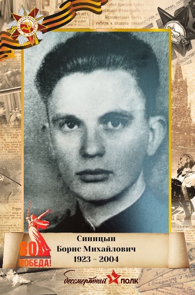 Синицын Борис Михайлович в 18 летнем возрасте в 1941 году ушел добровольцем на фронт, чтобы отстаивать свою Родину. Он стал офицером-артиллеристом, участником героической обороны Крыма, проявив храбрость и мужество в годы Великой Отечественной войны.