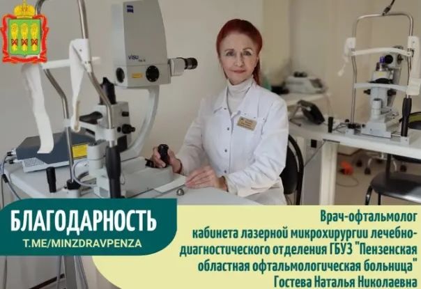 «Хочу поблагодарить врача-офтальмолога кабинета лазерной микрохирургии ГБУЗ "Пензенская областная офтальмологическая больница" Гостеву Наталью Николаевну, за профессионализм и внимание, которое она оказала в моём случае. В сентябре 2023 года, я была на приёме у доктора. Меня беспокоили сильные вспышки и сверкания в левом глазу. После осмотра, доктор обнаружила у меня разрыв сетчатки. Я была «мягко» сказать обеспокоена, так как у моего отца была такая же проблема. Доктор, Наталья Николаевна, успокоила меня и объяснила, что после лазерной коагуляции, у меня всё восстановится. 25 сентября 2023 г мне была сделана лазеркоагуляция сетчатки левого глаза. Доктор дала подробные рекомендации после проведённого лечения и рекомендовала прийти на осмотр через 6 месяцев. Сегодня я была на приеме у Натальи Николаевны, у меня всё восстановилось и зажило. Спасибо доктору!! Уважение и слова благодарности!»