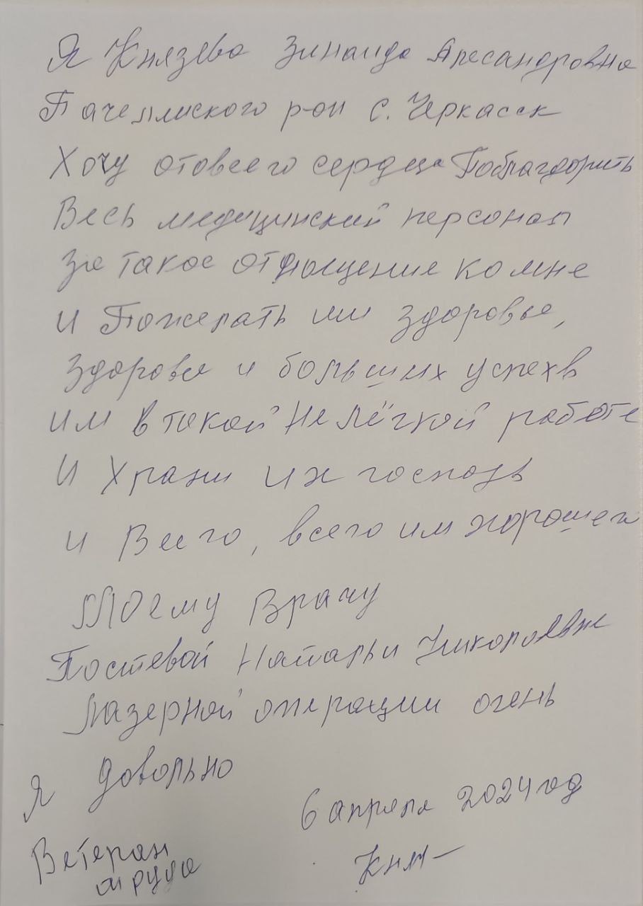 Пациенты часто отзываются с благодарностью о врачах и медсестрах нашего кабинета лазерной микрохирургии глаза. Вот ещё один такой отзыв о нашем враче, лазерном хирурге, Наталье Николаевне Гостевой и кабинете лазерной микрохирургии.